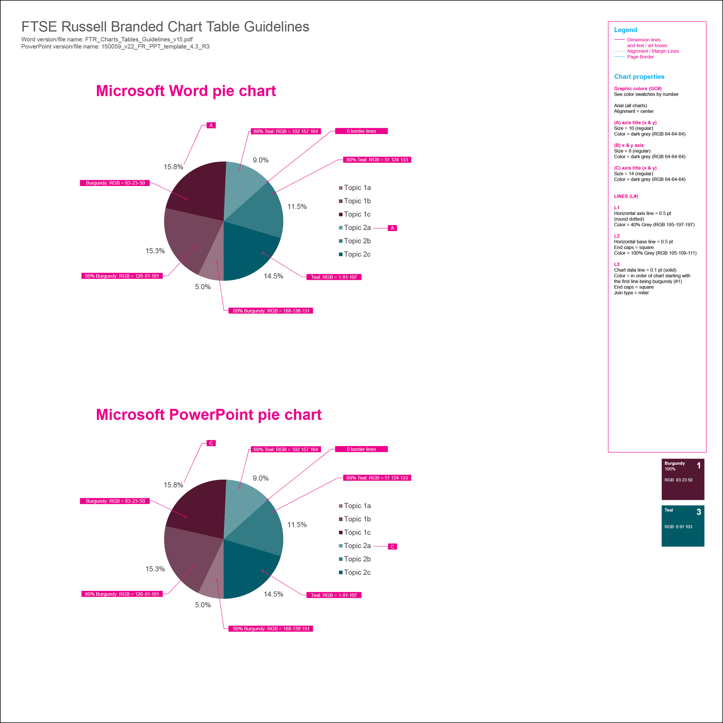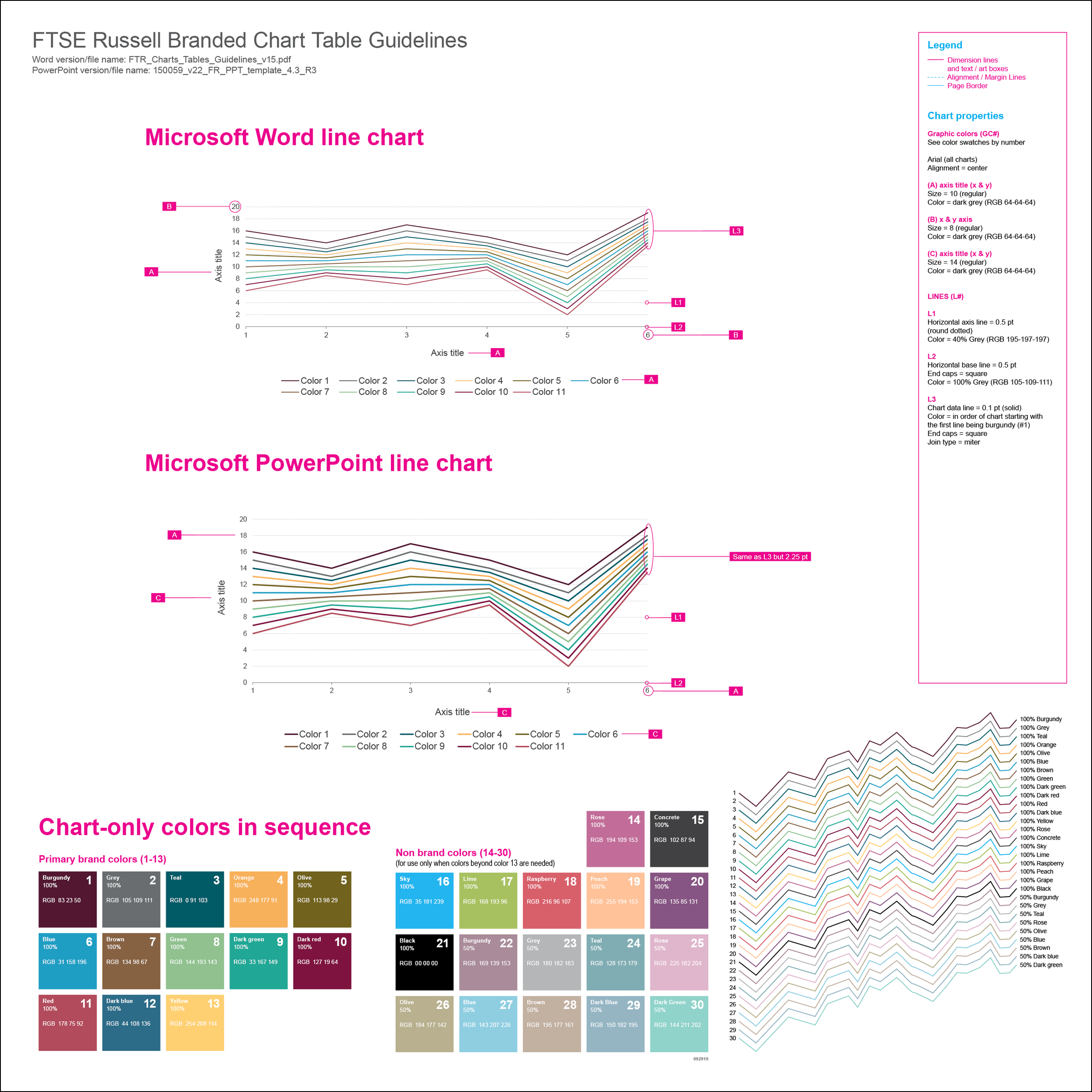 A collection of pages from the A4 document template created in InDesign. The Adobe template included notes for designers and screenshots of the different color swatches, character styles, paragraph styles, and chart styles built into the template. The same template was also designed in a US letter size and then crafted into a Microsoft Word template. The Word versions of the templates included custom themes, tables, graphs, text boxes, and charts that could integrate with the branded Microsoft Excel reports.