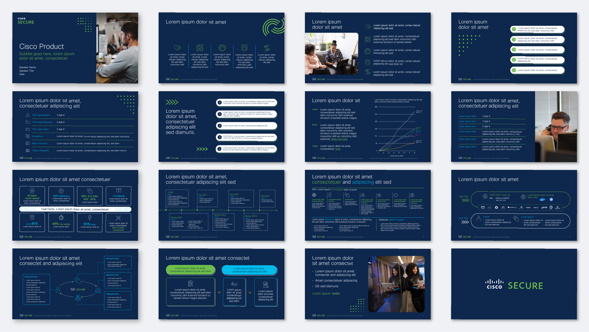 This Cisco Secure PowerPoint presentation displays select pages with various layouts, custom bullet lists, photographs, icons, tables, charts, infographics, a timeline, a product overview, diagrams, and opening and closing slides.